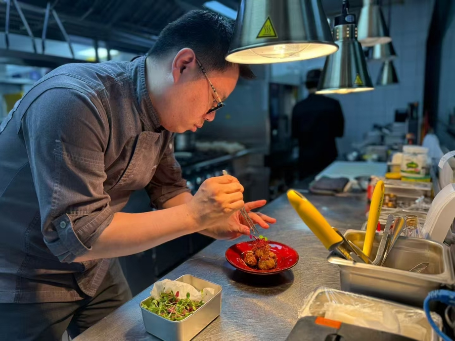 光明玖壹玖主打创意融合西餐,图为主厨正在制作带鱼卷。