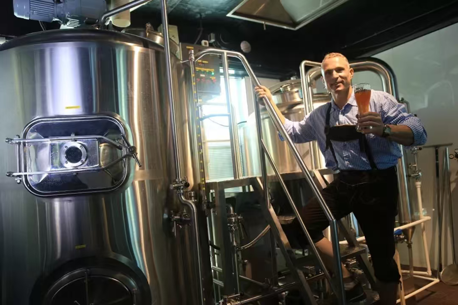 Zapfler 扎夫德国精酿餐厅老板Dirk Fauenheim向记者展示他精酿的德式啤酒。
