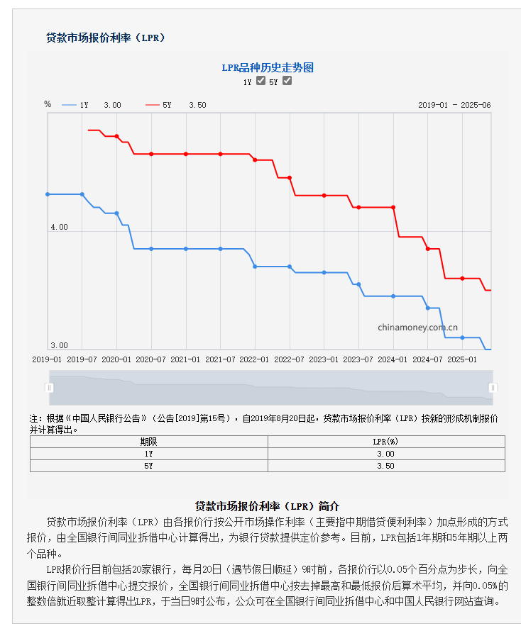 6月20日,中国人民银行授权全国银行间同业拆借中心公布,2025年6月20日贷款市场报价利率(LPR)为: 1年期LPR为3.0%(上次为3.0%), 5年期以上LPR为3.5%(上次为3.5%)。以上LPR在下一次发布LPR之前有效。