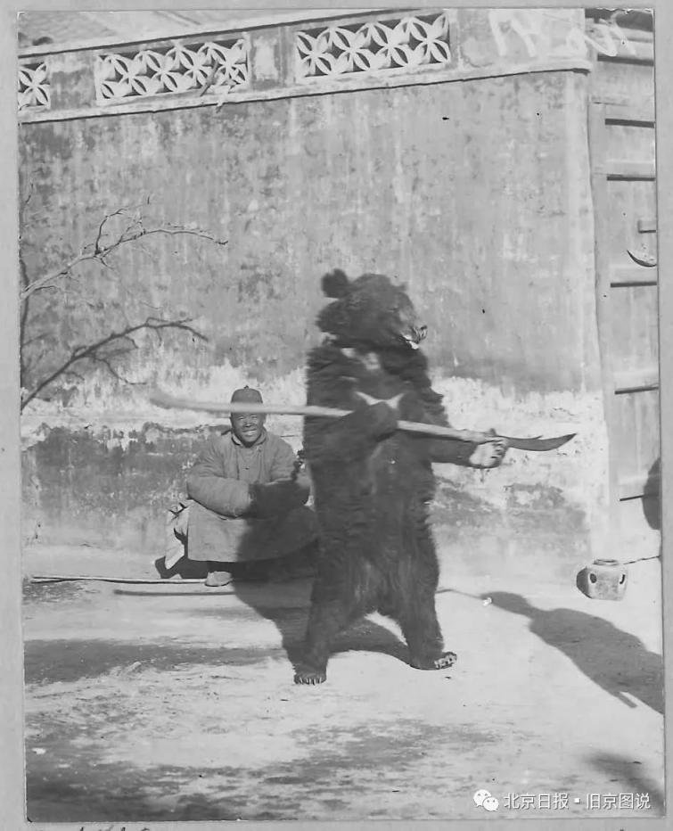 老北京街头的马戏和杂耍表演很受孩子们欢迎。图为耍狗熊表演。